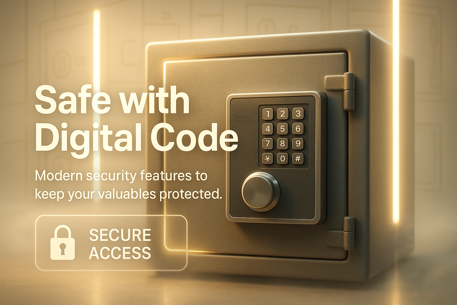 /Collection: /by davooda/Type: PNG/A visually striking 3D render of a modern safe with a digital keypad, showcasing advanced security features. Ideal for security product marketing and technology-related content.