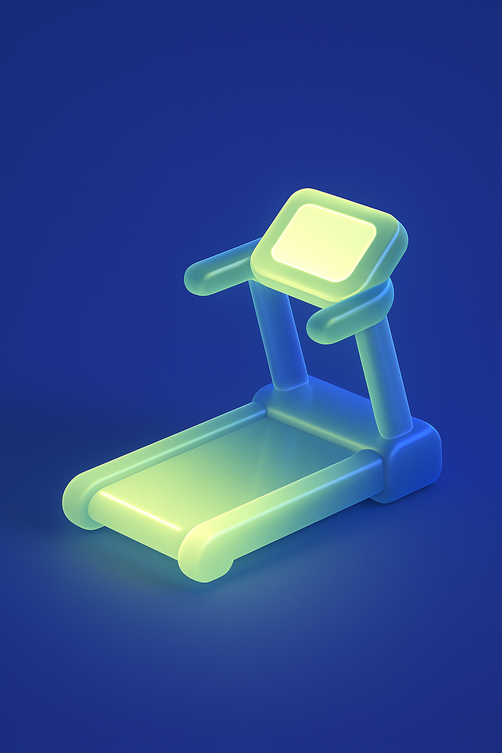 A realistic 3D representation of a treadmill, featuring light yellow-green and blue colors. The icon glows softly, creating an atmospheric shadow effect against a solid blue background.