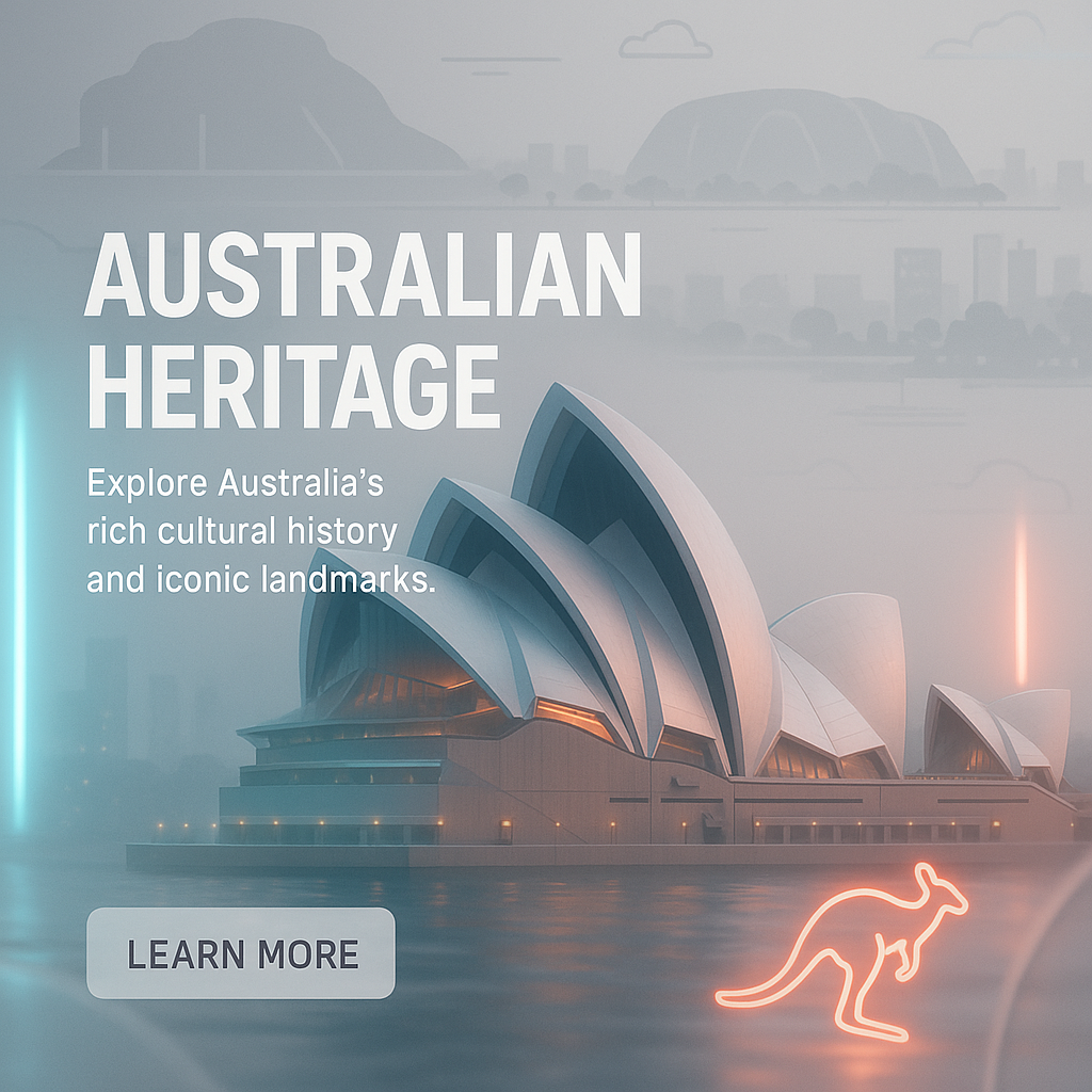 Stylish promotional graphic highlighting Australia's cultural heritage and landmarks, featuring modern design elements and a call-to-action for exploration.