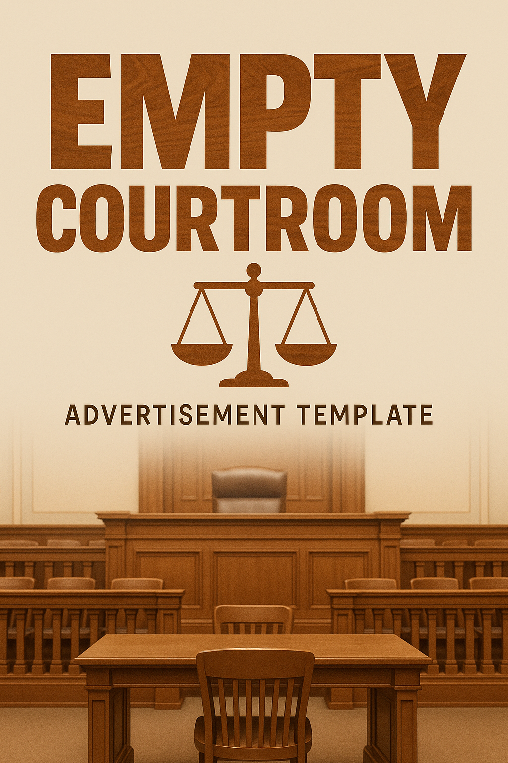 /Collection: /by davooda/Type: PNG/Professional advertisement template showcasing an empty courtroom scene, ideal for law firms or legal services marketing. The design features a balanced scale symbolizing justice, making it suitable for various legal promotions.