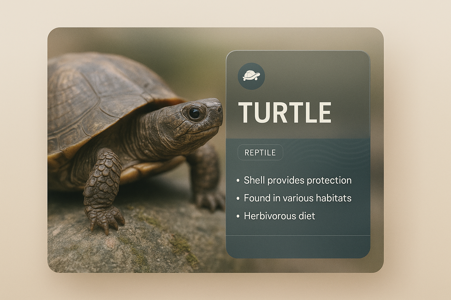 A beautifully designed image featuring a turtle with an informative overlay. The overlay includes the title 'TURTLE', a description, and a clean, modern aesthetic with a smooth gradient background.