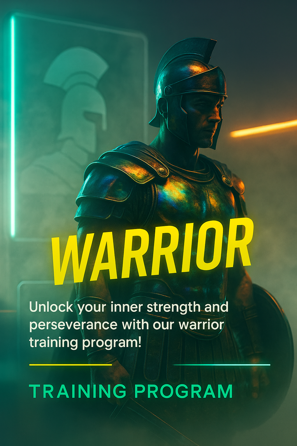 /Collection: /by davooda/Type: PNG/This image features a striking neon-themed design for a warrior training program. It includes a bold 'WARRIOR' headline, engaging visuals, and layered elements creating depth.