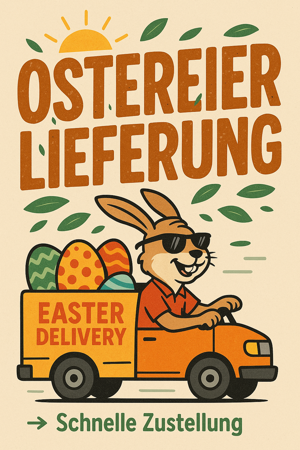 Fun and colorful graphic showcasing a cartoon bunny delivering Easter eggs in a truck, ideal for seasonal promotions and festive marketing material.