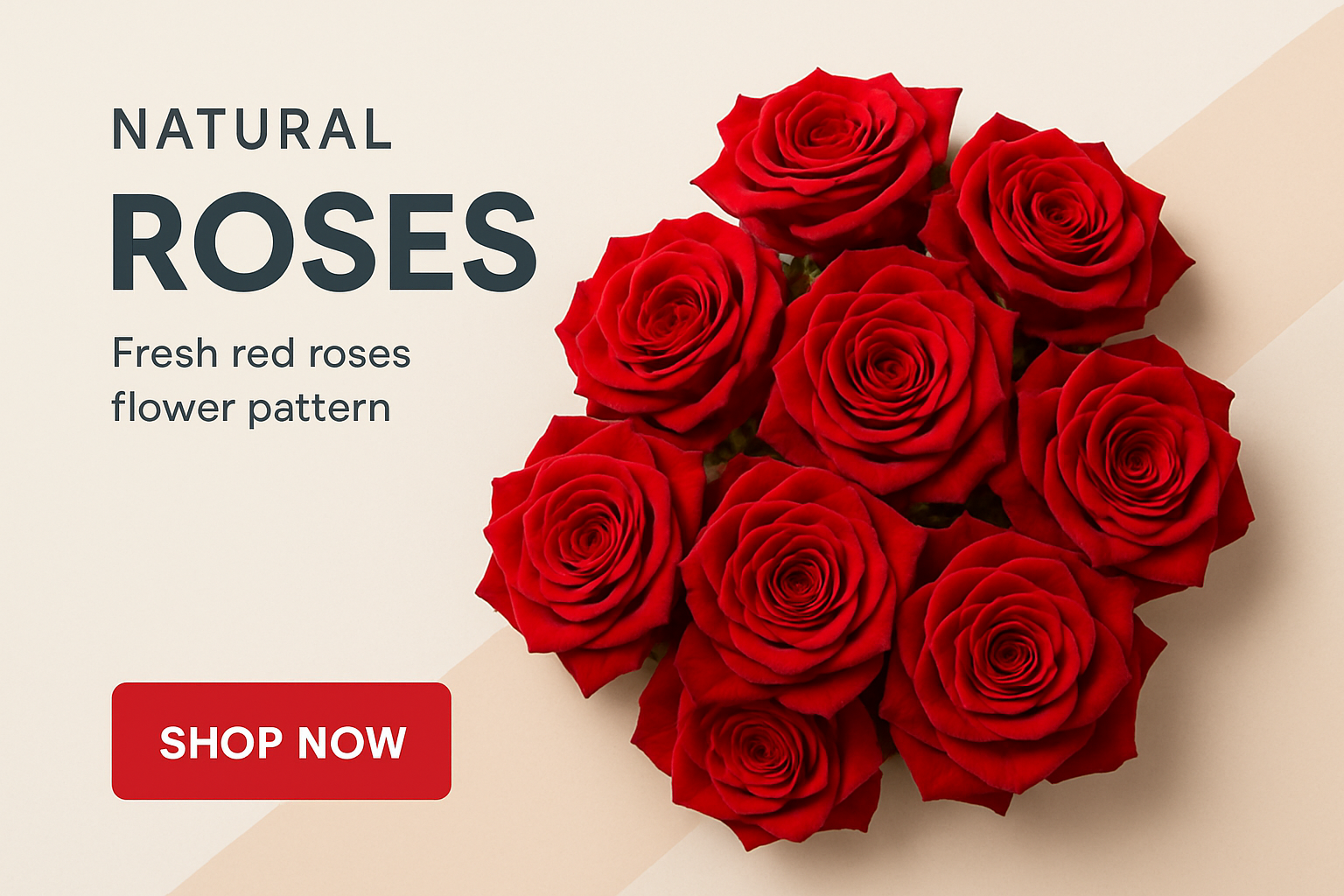 A top view of fresh red roses arranged in a vibrant pattern, featuring bold typography and a clean background that enhances the floral beauty.