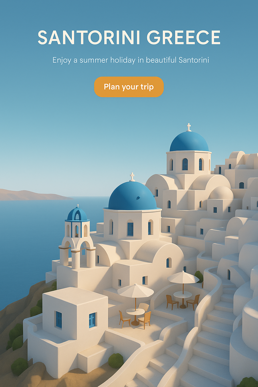 A captivating 3D illustration of Santorini, Greece, showcasing iconic white buildings with blue domes, set against a serene ocean backdrop. The design features an inviting layout for travel enthusiasts.