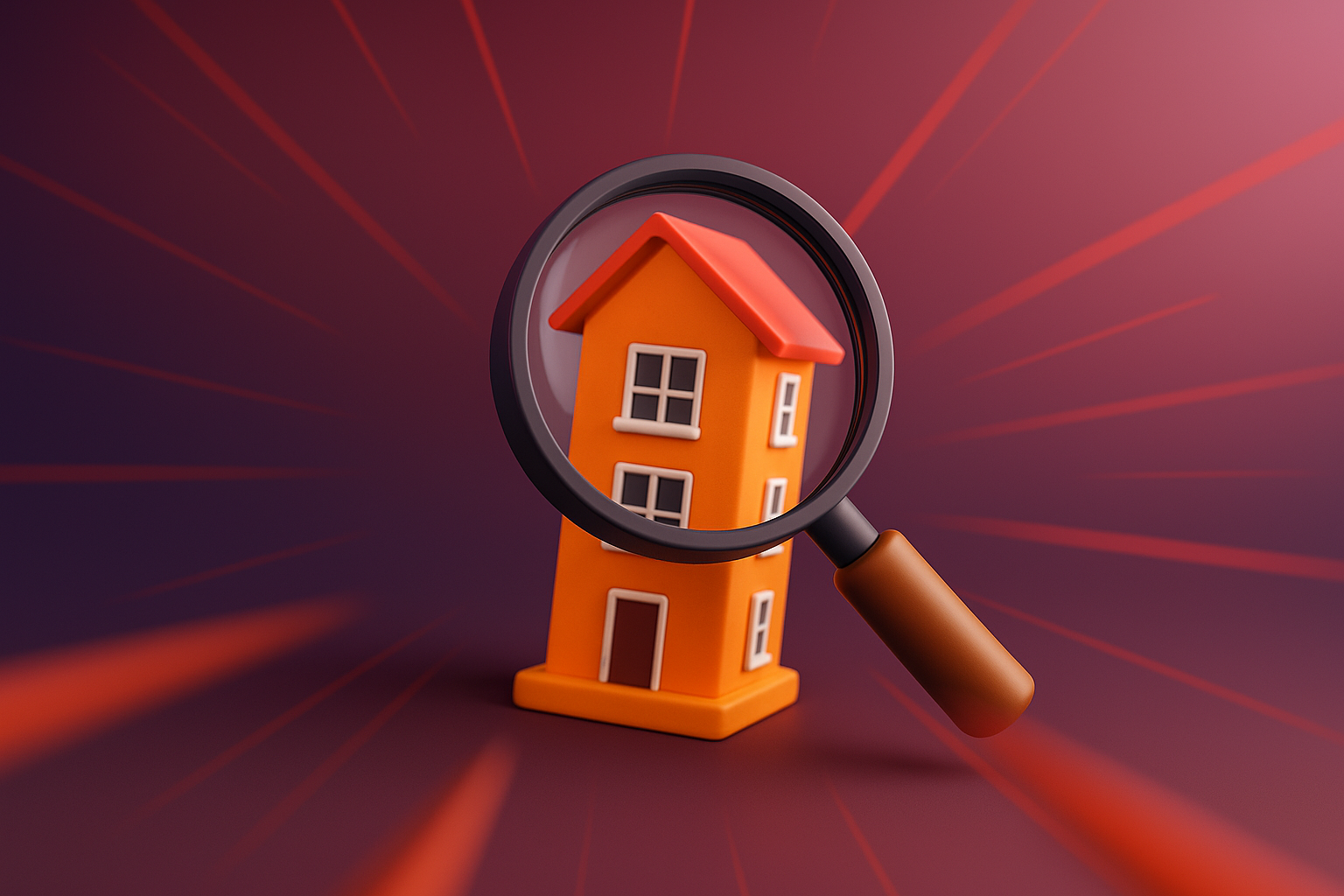 /Collection: /by davooda/Type: PNG/A vibrant 3D illustration depicting a magnifying glass over a colorful house model, emphasizing the search for a new home. The dynamic background creates an engaging atmosphere.