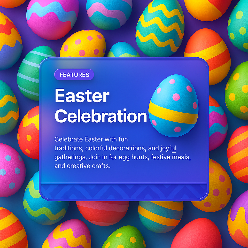 A colorful collection of 3D Easter eggs set against a vibrant background. Features a prominent block highlighting 'Easter Celebration' with engaging text and graphics.