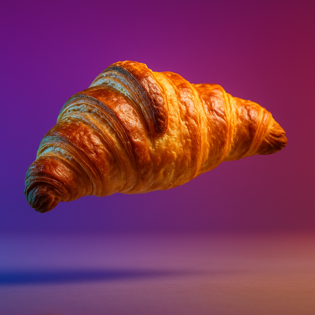 A beautifully lit croissant appears to float mid-air against a vibrant gradient background. The interplay of light highlights its flaky texture, creating an engaging visual.