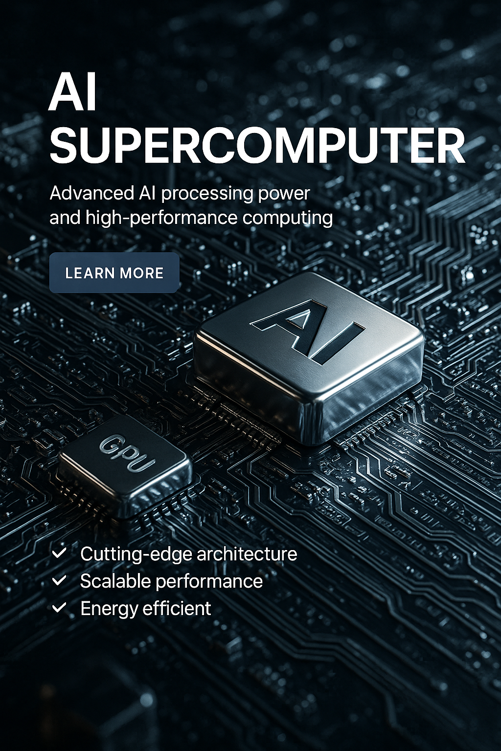 Modern promotional graphic highlighting the features of an AI supercomputer with a sleek design, ideal for tech marketing and informational campaigns.