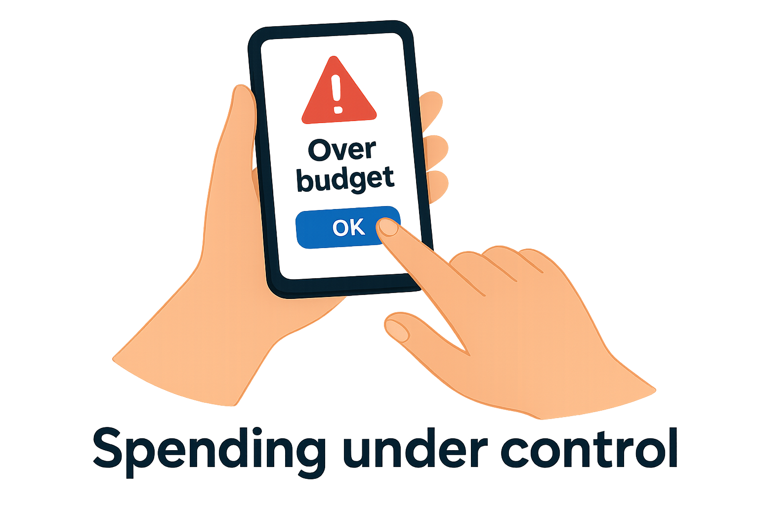 /Collection: /by davooda/Type: PNG/Illustrative graphic depicting a smartphone alert about budget status, showcasing a user interacting with a spending management app. Ideal for financial planning content.