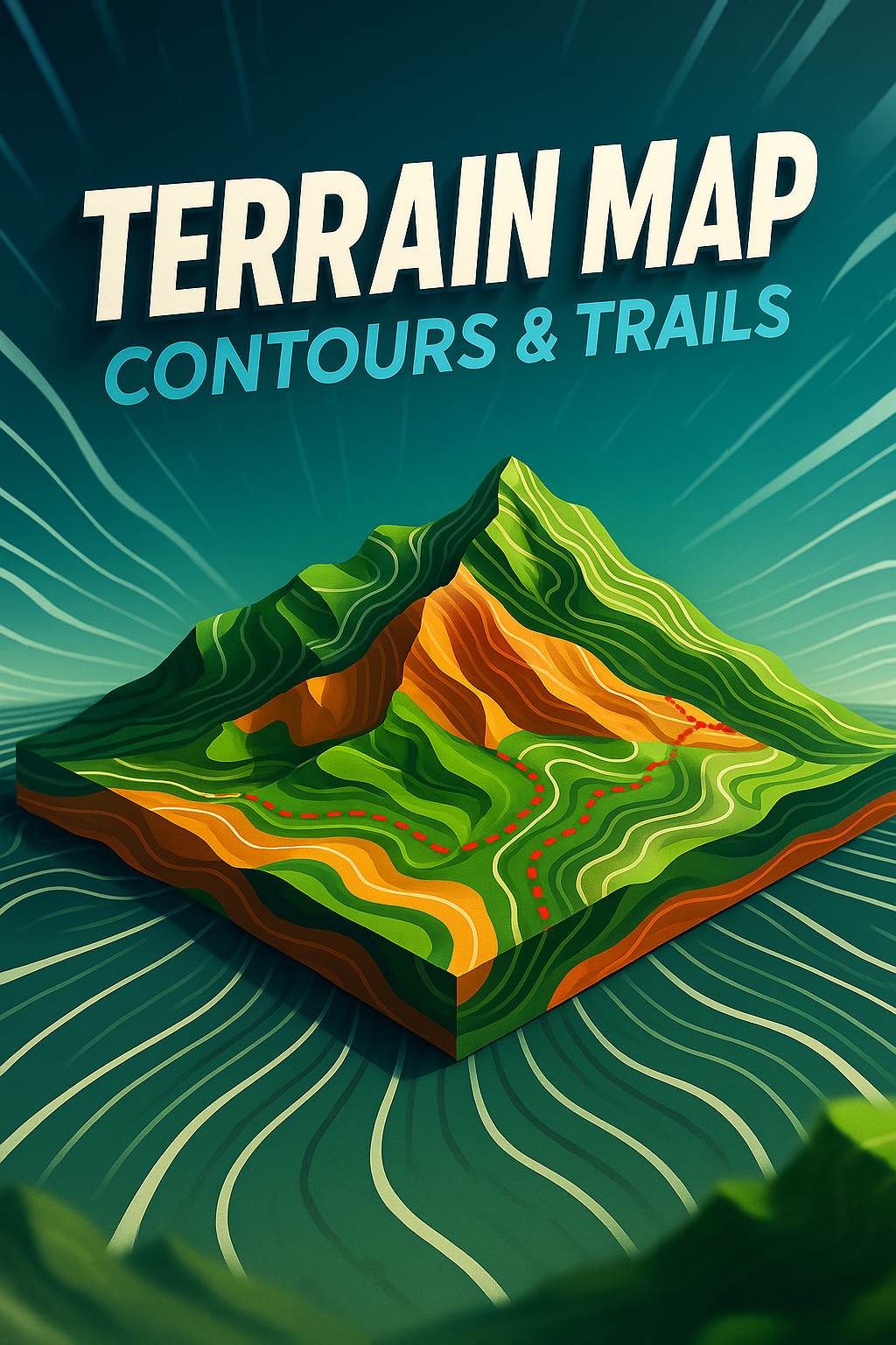 /Collection: /by davooda/Type: PNG/A vibrant 3D illustration of a terrain map featuring colorful contours and trails. The dynamic composition showcases layered geography with a smooth gradient background, enhancing the visual depth.