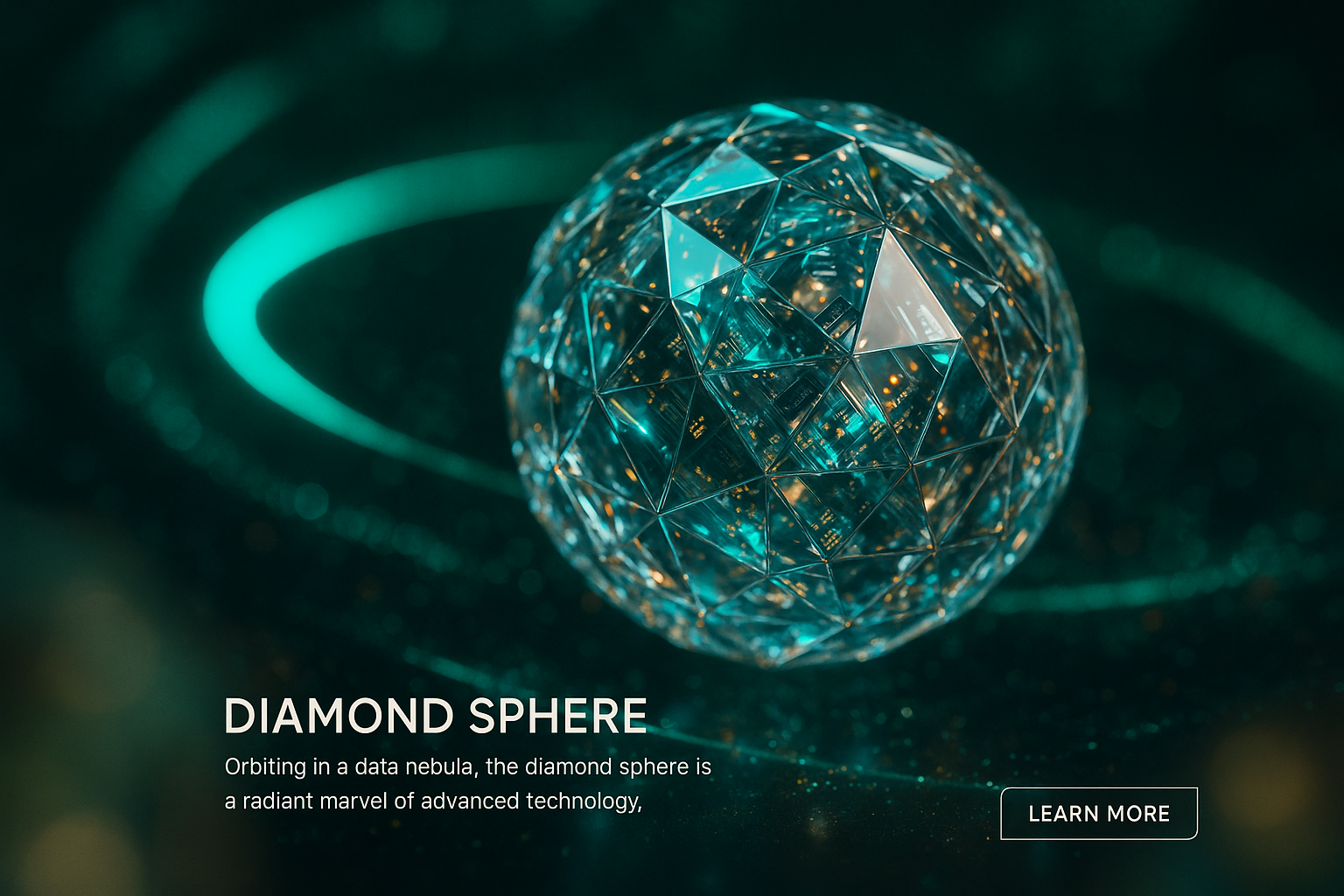 /Collection: /by davooda/Type: PNG/A hyperrealistic diamond sphere floats in a data nebula, showcasing intricate details and glowing elements. The design features soft lighting and vibrant colors, emphasizing its high-tech aesthetics.