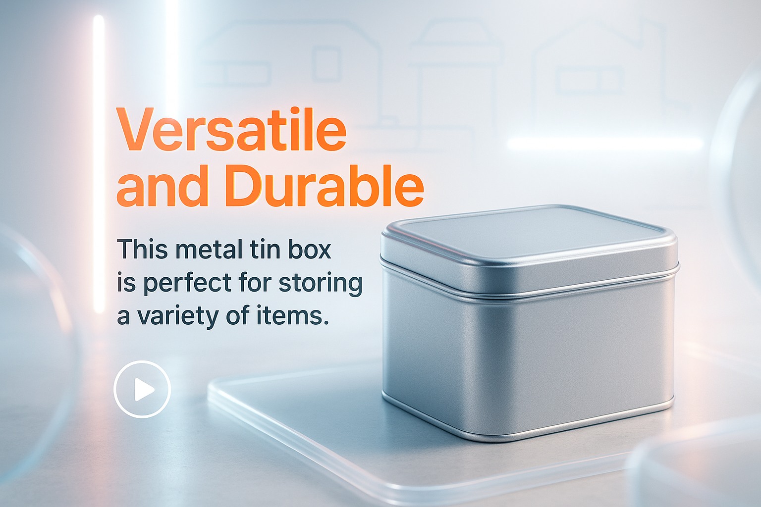 Modern promotional image featuring a metal tin box with a sleek design, highlighting its versatility for storage. Ideal for e-commerce and product showcases.