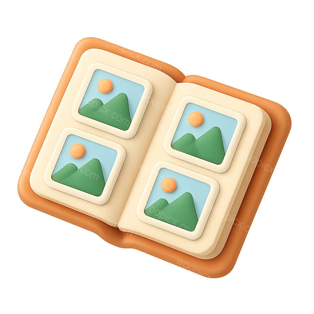 A visually appealing 3D icon of an open photo album featuring four pictures. Each picture displays a scenic view with mountains and a sun, designed with a soft, isometric style.