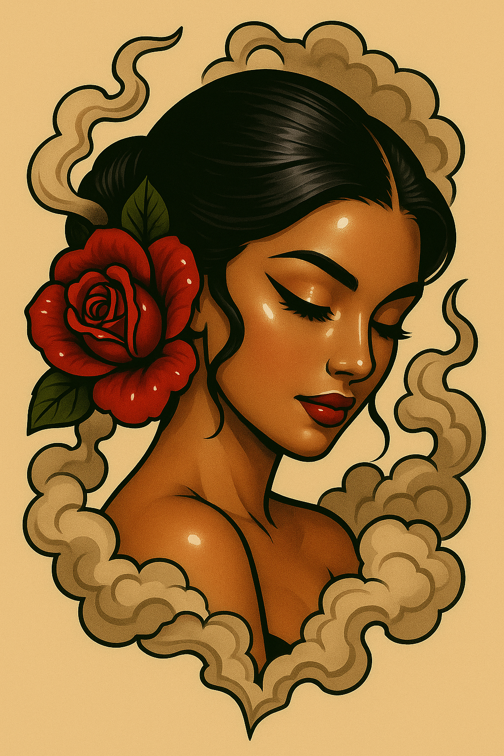 Stylized Tattoo Art of a Woman with a Rose and Smoke