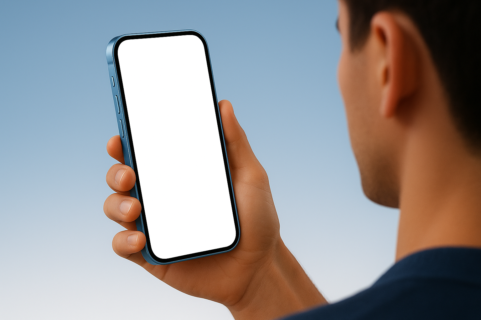 /Collection: /by davooda/Type: PNG/A side view of a blue smartphone held by a person, showcasing a blank white screen. The phone features rounded edges and appears slightly narrower, set against a gradient background.