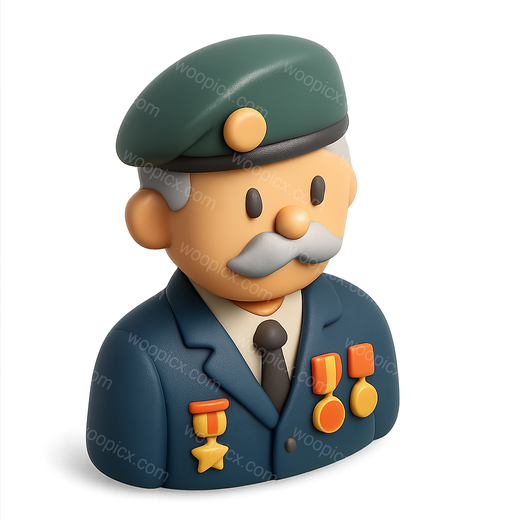 A 3D icon of a veteran character wearing a green cap and a uniform adorned with medals. The design features a three-quarter view, emphasizing volumetric details.