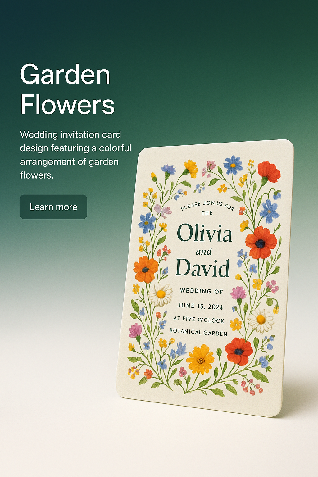 A beautifully designed wedding invitation card featuring vibrant garden flowers. The card includes names and wedding details, set against a gradient background.