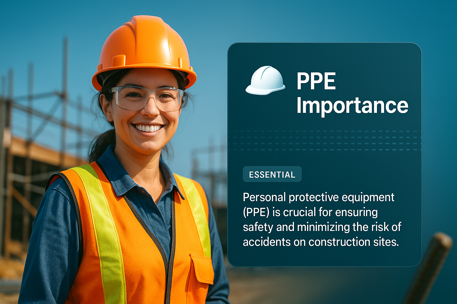 /Collection: /by davooda/Type: PNG/A cheerful female construction worker in PPE stands at a work site, emphasizing the importance of safety gear. She wears a hard hat and safety vest, smiling confidently.