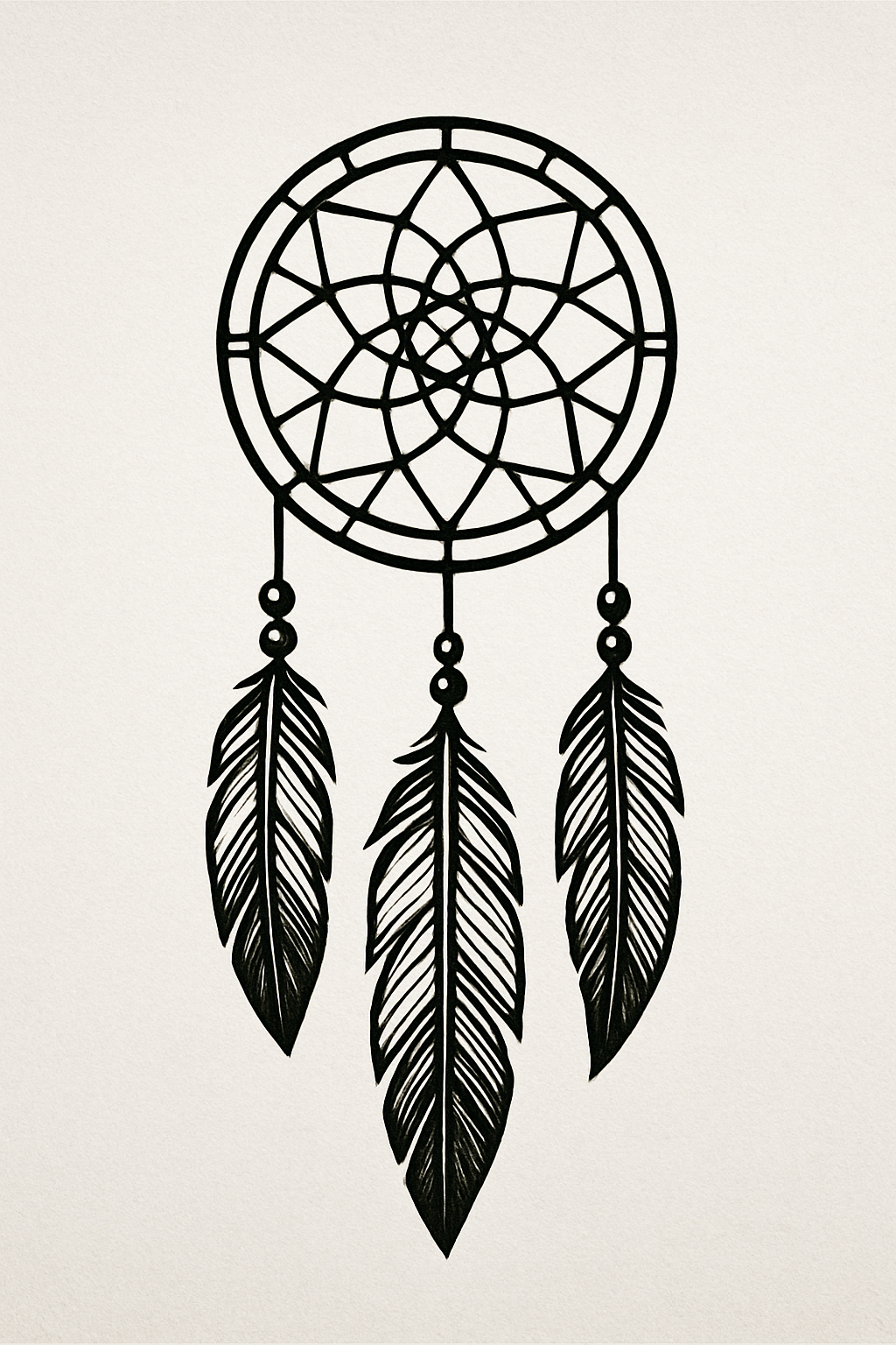 This is a minimalist illustration of a dreamcatcher featuring intricate web patterns and feathers. The design is suitable for art prints, tattoos, or decorative purposes.