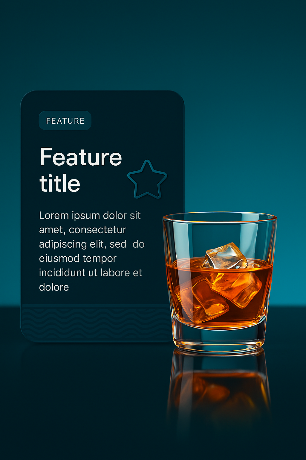 /Collection: /by davooda/Type: PNG/A beautifully designed whiskey glass filled with ice, reflecting on a smooth surface. Beside it, a feature block highlights key information in a modern layout.