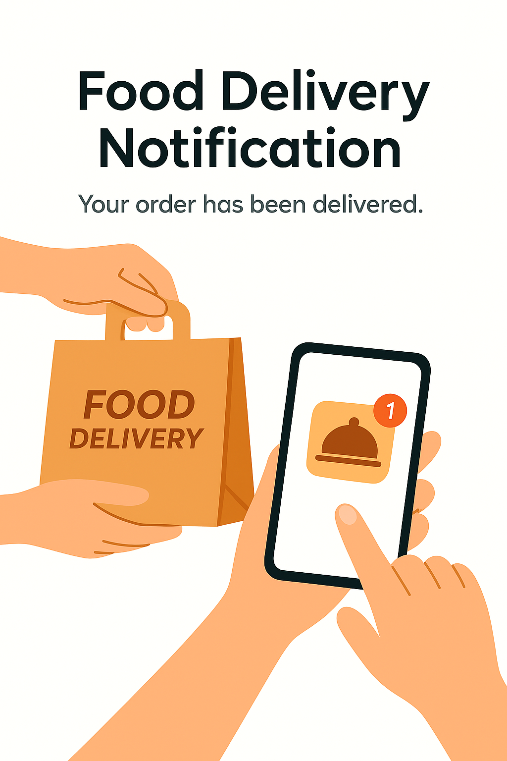 A modern digital illustration depicting a food delivery notification on a smartphone alongside a takeout bag, ideal for restaurant apps or delivery services.