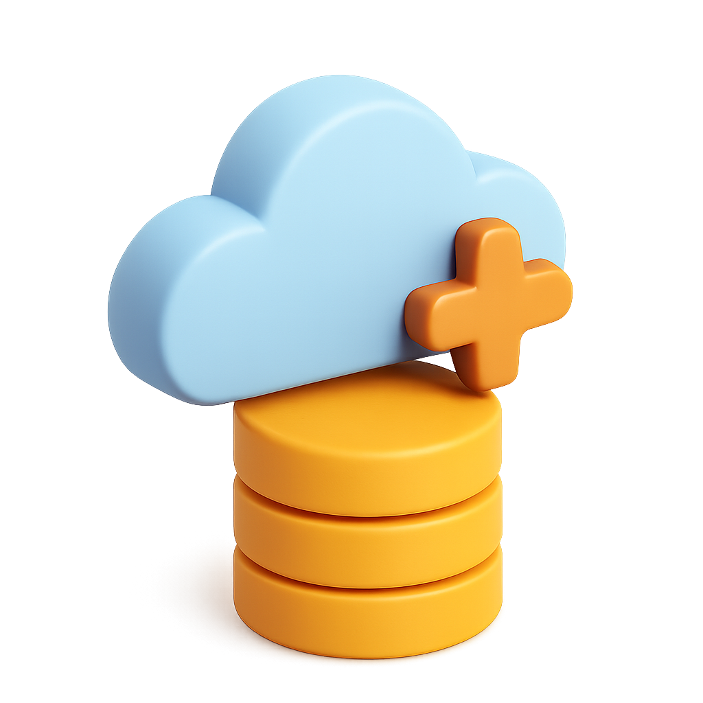 /Collection: /by davooda/Type: PNG/A visually appealing 3D icon depicting a cloud above stacked data disks, featuring a plus symbol. The design has a smooth, isometric look with vibrant colors and a transparent background.