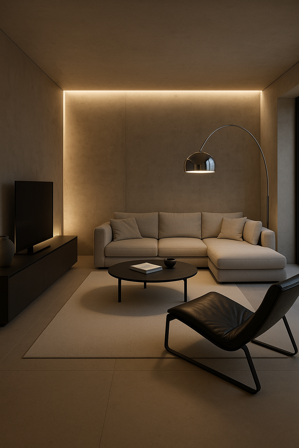 A contemporary minimalist living room featuring soft ambient lighting, a stylish sofa, and a sleek coffee table. The design incorporates concrete elements and elegant Italian details.
