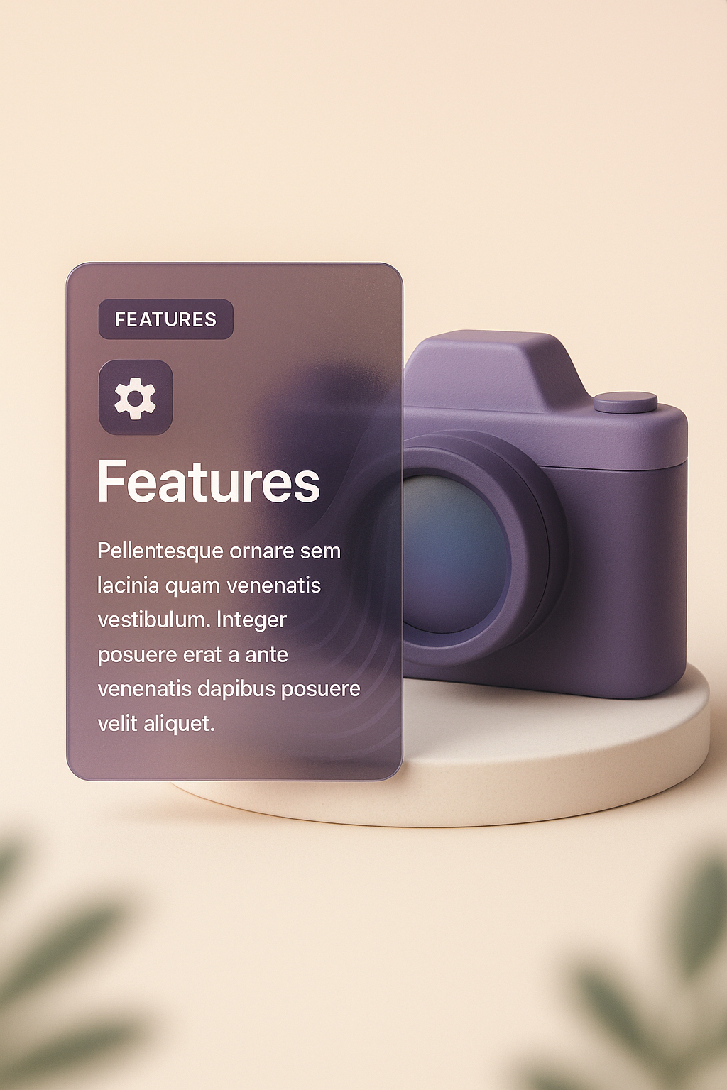 /Collection: /by davooda/Type: PNG/A stylish web design featuring a 3D camera illustration on a smooth gradient background. The design integrates a translucent overlay with text, enhancing visual appeal.