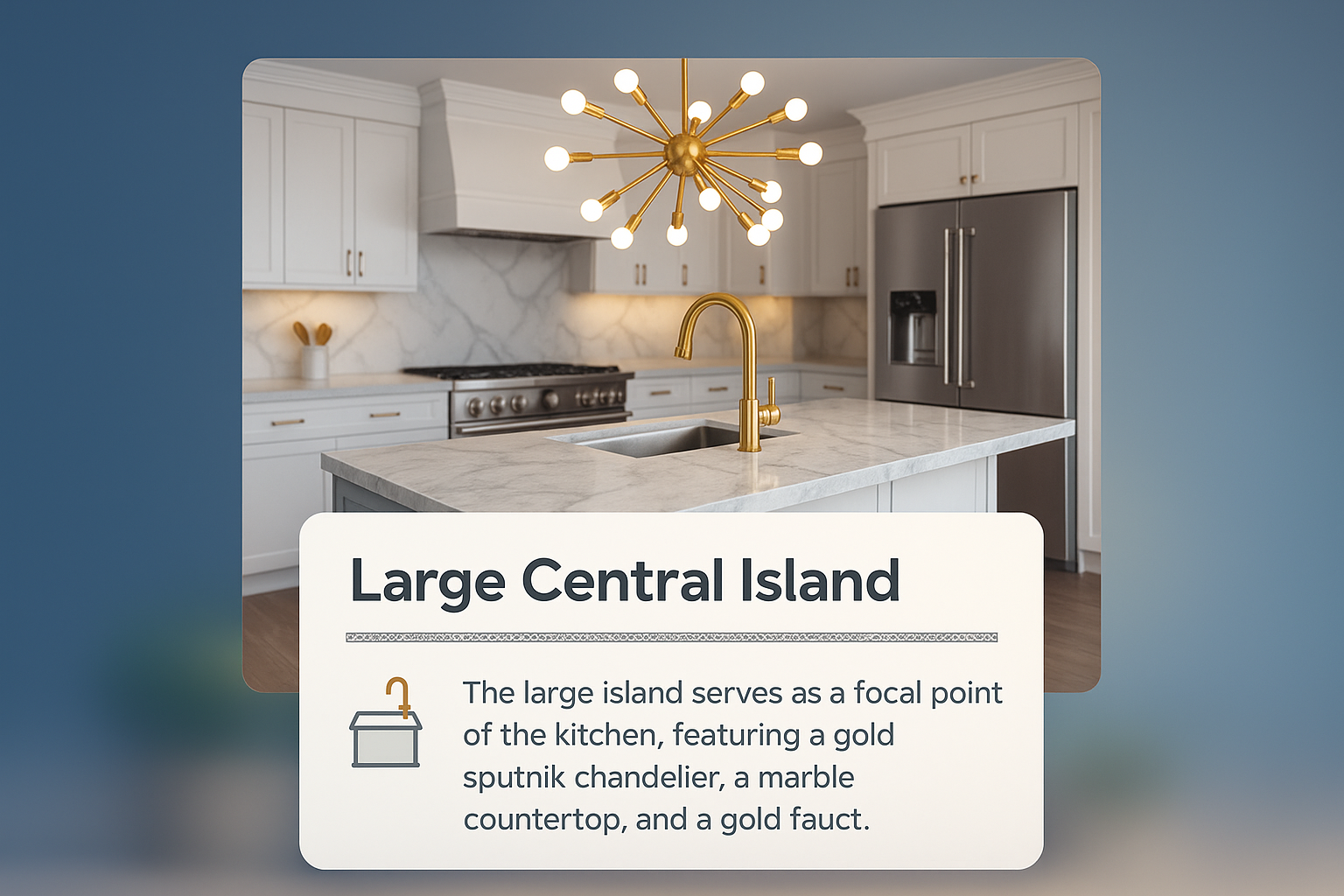 /Collection: /by davooda/Type: PNG/This image showcases a stunning kitchen featuring a large central island, a stylish gold faucet, a sputnik chandelier, and sleek stainless steel appliances against white marble countertops.