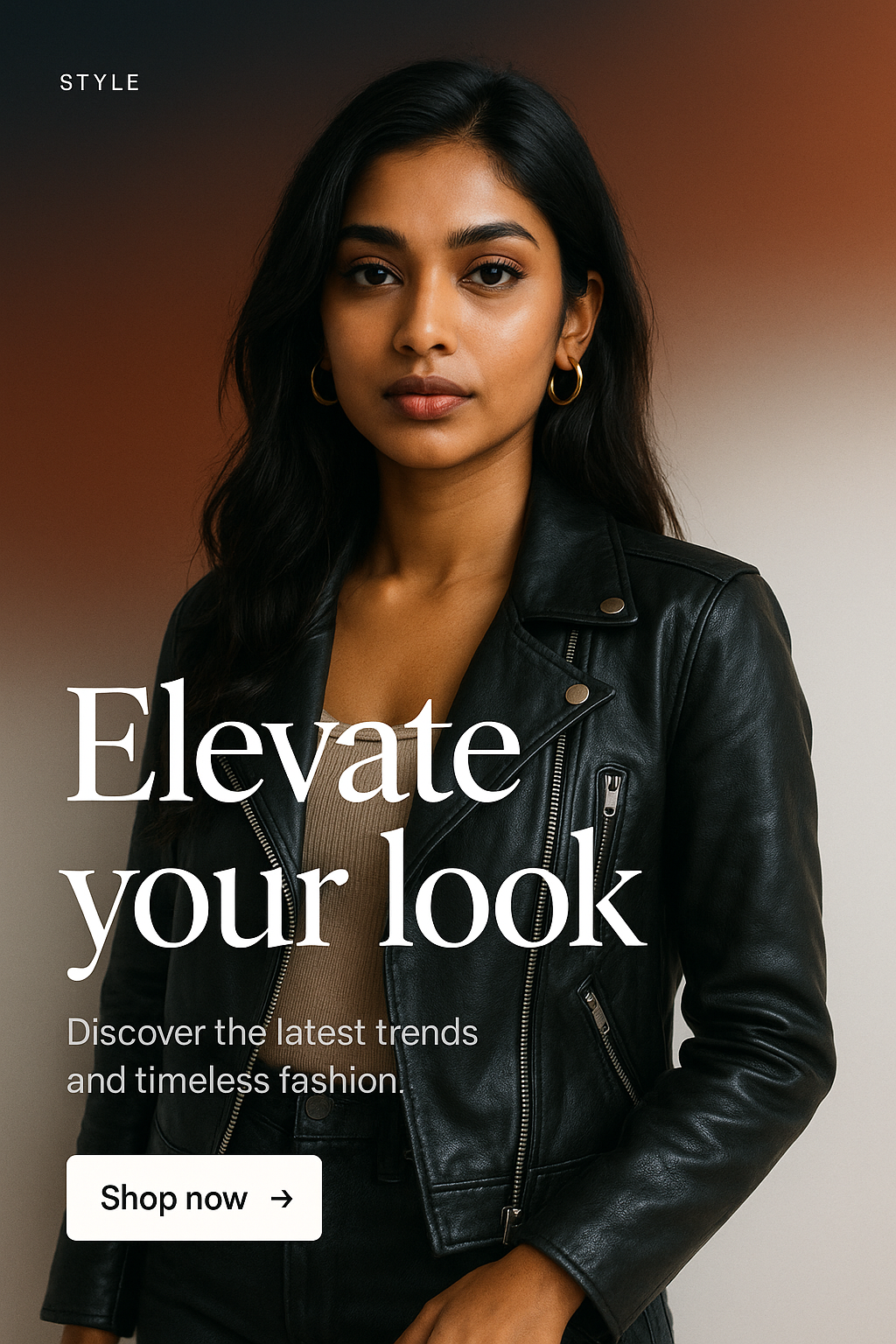 A striking portrait of a young Indian woman in a leather jacket, set against a gradient background. The design features stylish text promoting fashion, creating an inviting atmosphere.