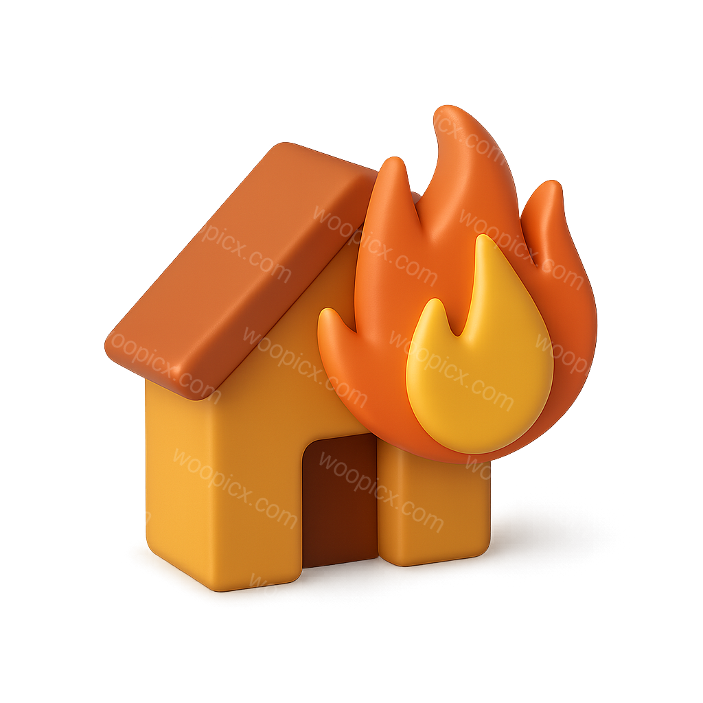 A vibrant 3D icon depicting a house with flames, showcasing a transparent background and an isometric perspective. The design features volumetric shapes with a modern aesthetic.