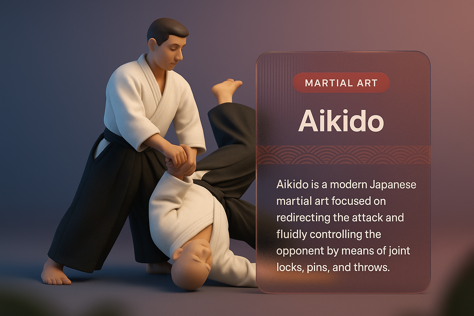 /Collection: /by davooda/Type: PNG/A captivating 3D illustration showcasing two Aikido practitioners in action, with a stylish overlay card detailing the art's essence. The background features a smooth gradient.