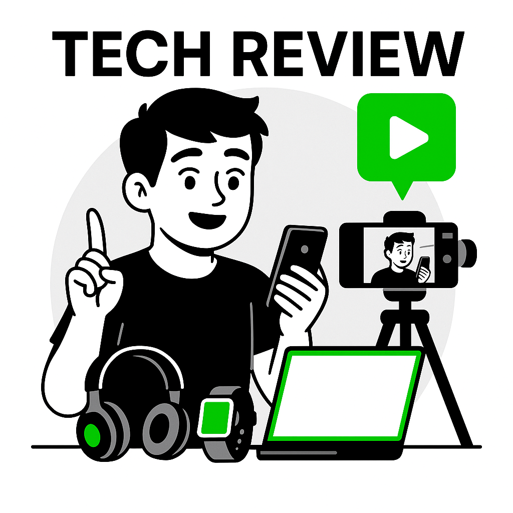 Illustrative Tech Review Graphic Featuring Devices and Content Creation