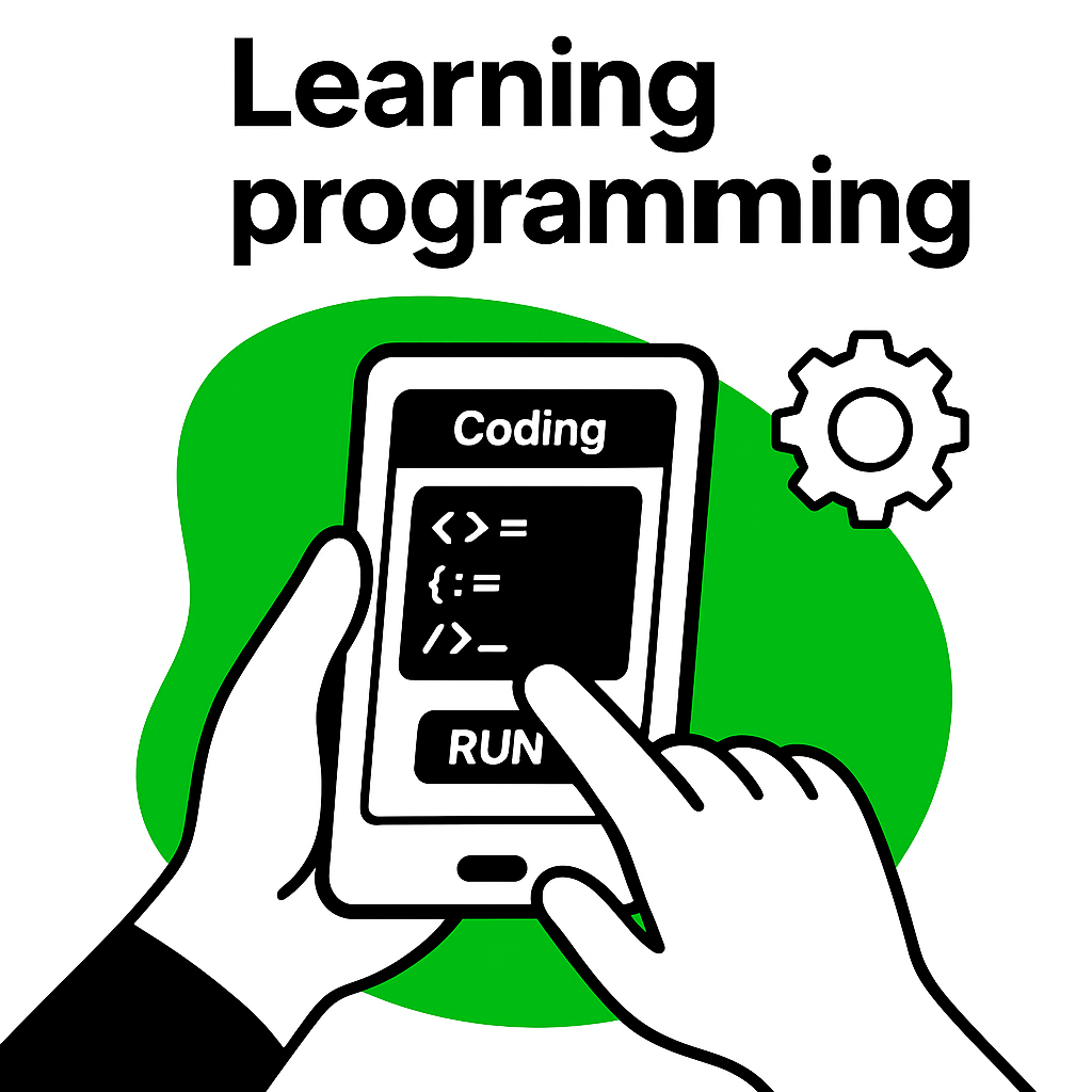 A modern illustration depicting hands interacting with a smartphone displaying coding syntax, designed to engage audiences interested in programming education.