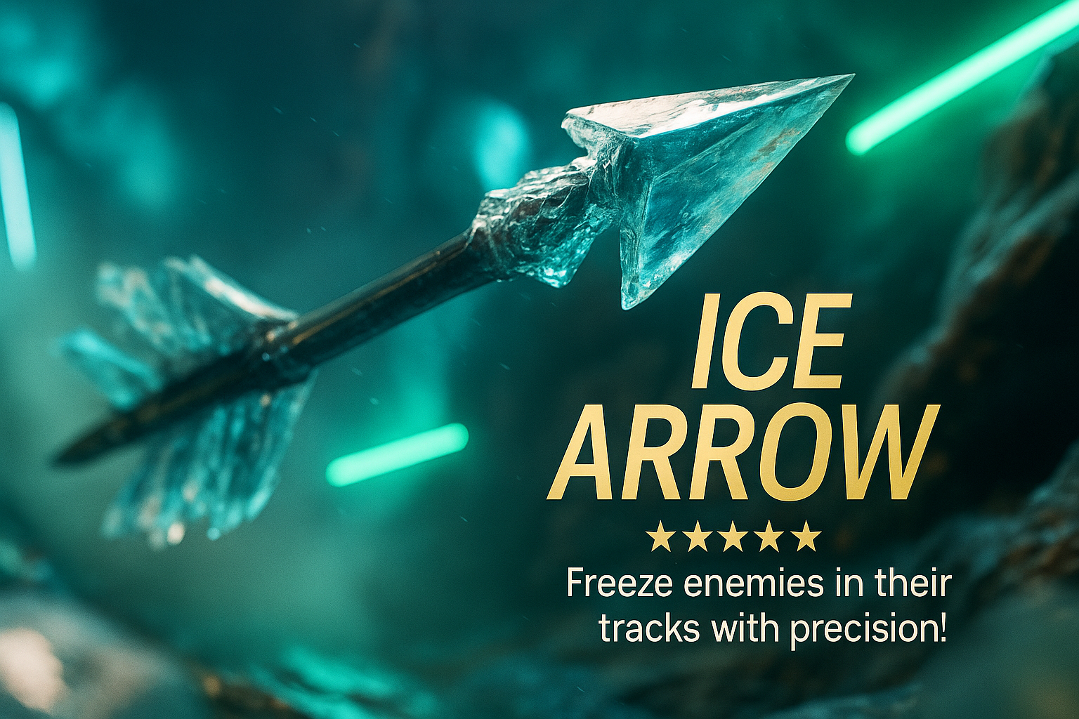 A visually striking design featuring an ice arrow amidst a dynamic neon-lit scene. The text emphasizes its precision in freezing enemies, enhancing engagement.