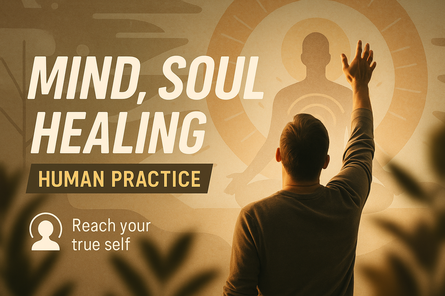 /Collection: /by davooda/Type: PNG/A visually striking promotional graphic focused on mind and soul healing, featuring a serene figure reaching out towards a spiritual symbol, ideal for wellness and personal growth branding.
