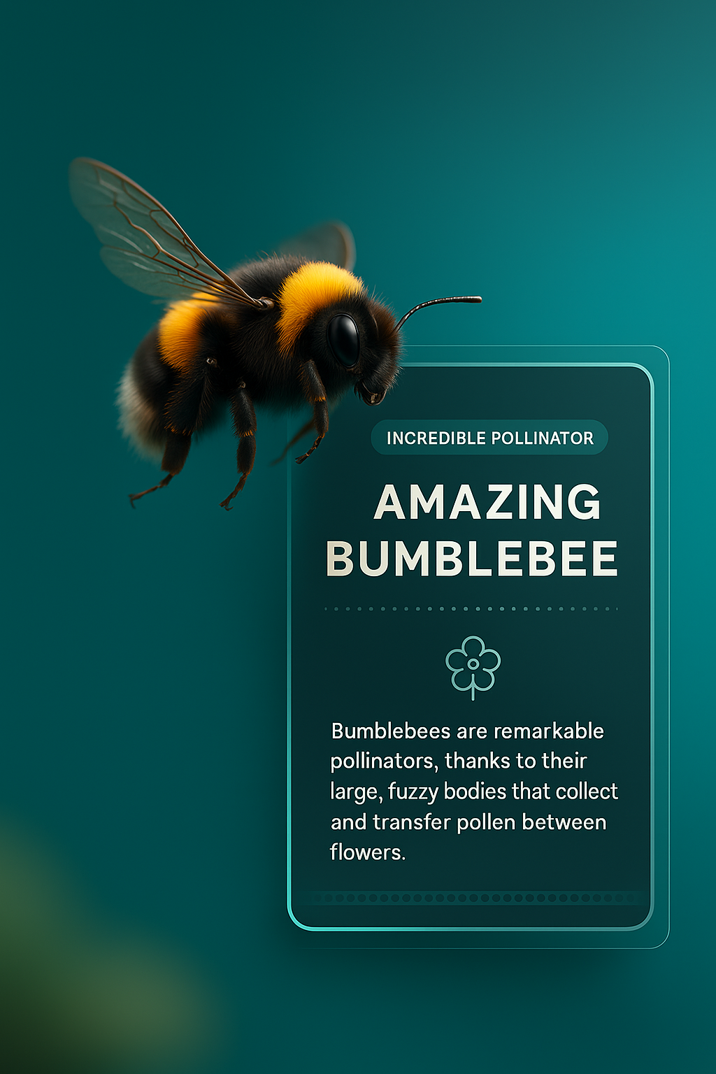 /Collection: /by davooda/Type: PNG/A stunning macro shot of a bumblebee flying against a gradient background. The image features an informative overlay highlighting the bee's role as a remarkable pollinator.