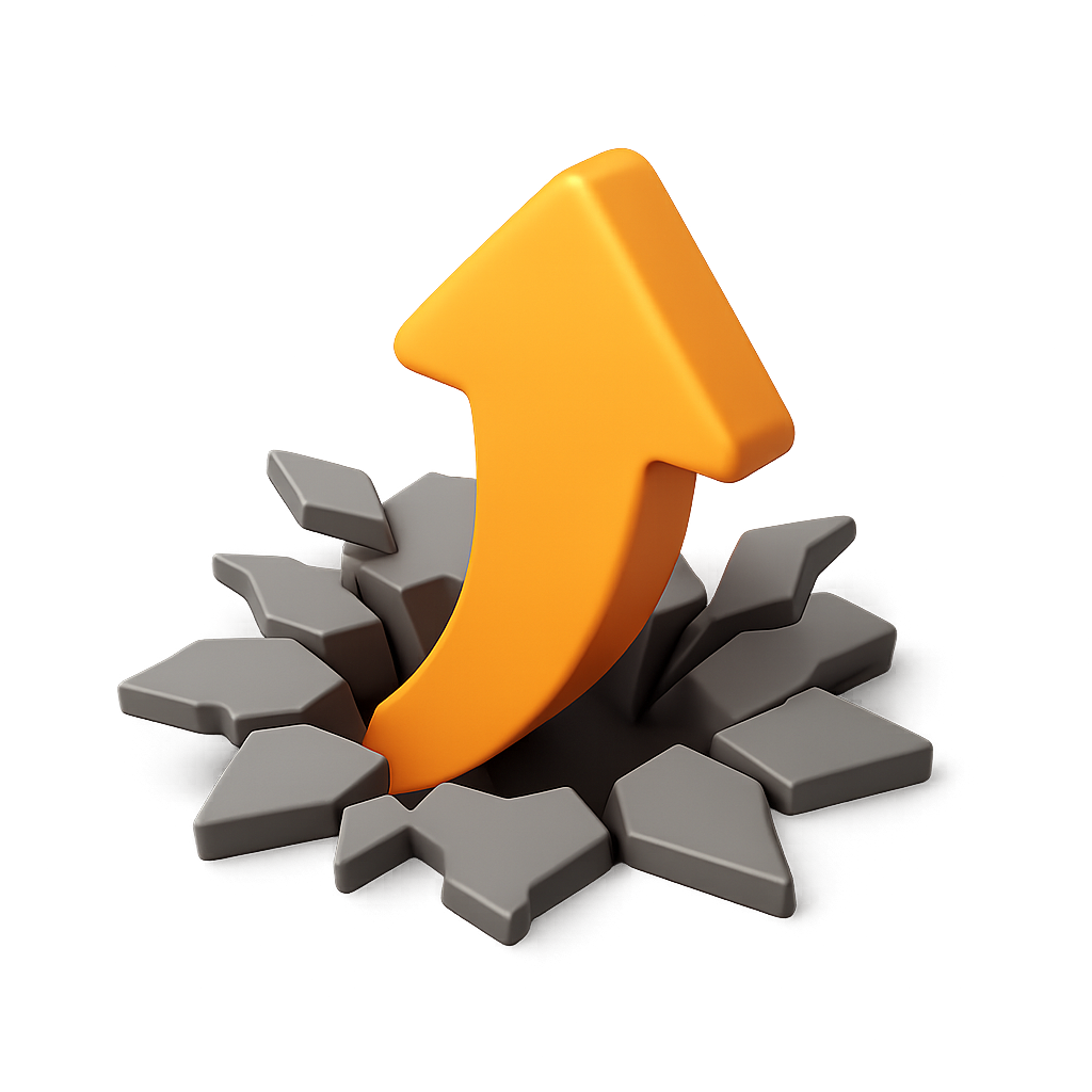 A striking 3D icon featuring an upward orange arrow emerging from a cracked surface, designed with a transparent background and isometric perspective.