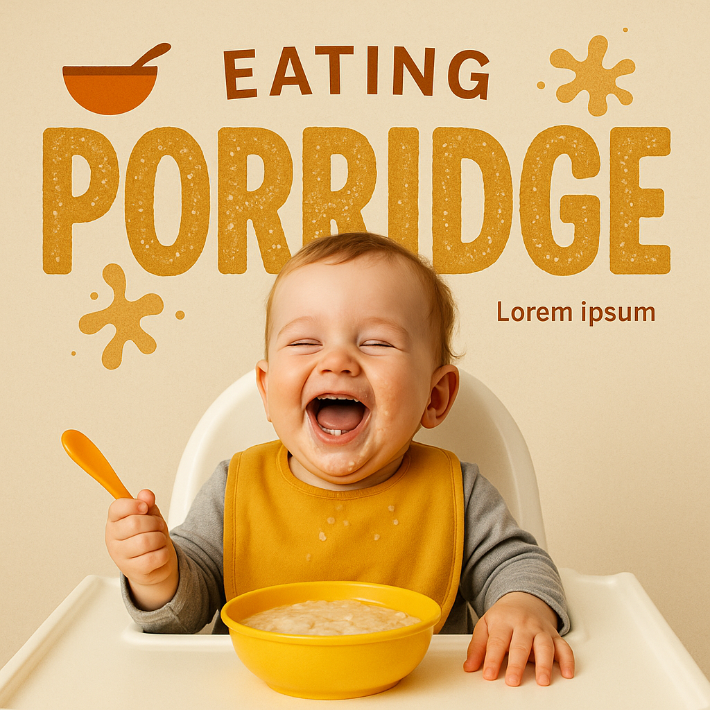 Cheerful image of a baby laughing while eating porridge, featuring warm colors and playful design elements. Ideal for parenting blogs or food-related content.