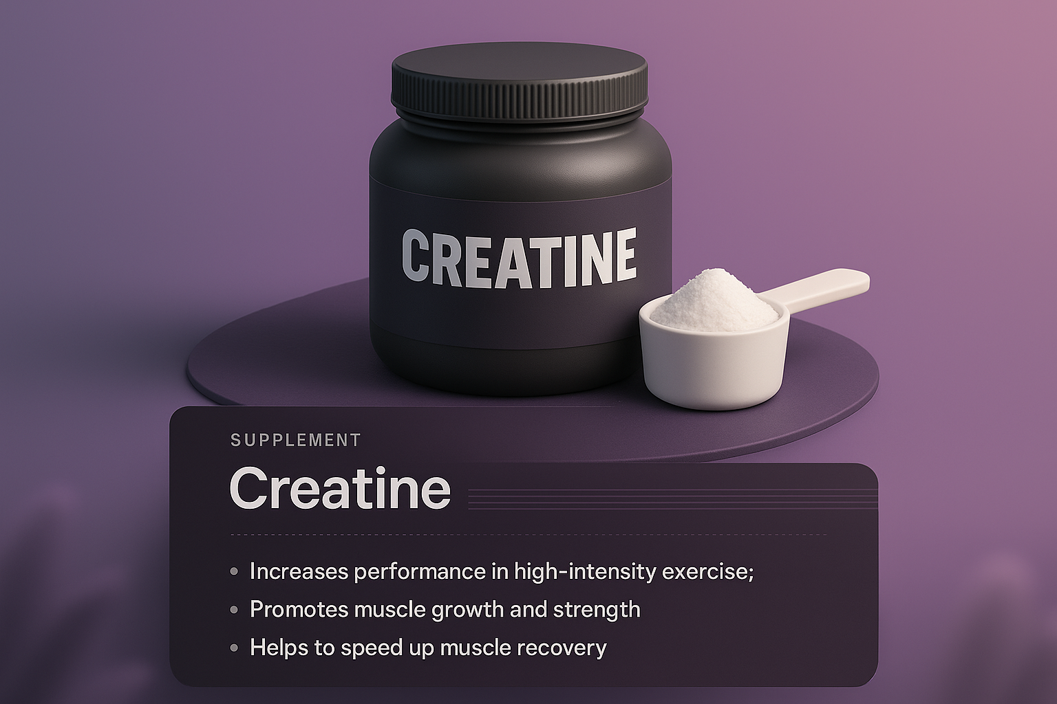 /Collection: /by davooda/Type: PNG/A visually appealing 3D illustration of a creatine supplement container with a scoop and powder. The design features a dark background and integrated text elements highlighting benefits.
