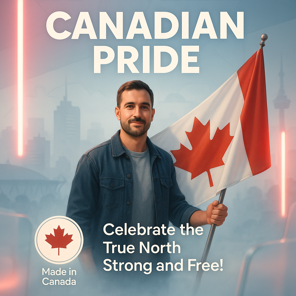 /Collection: /by davooda/Type: PNG/Vibrant promotional graphic showcasing a man holding a Canadian flag, symbolizing national pride. Ideal for cultural events or marketing campaigns focused on Canadian heritage.