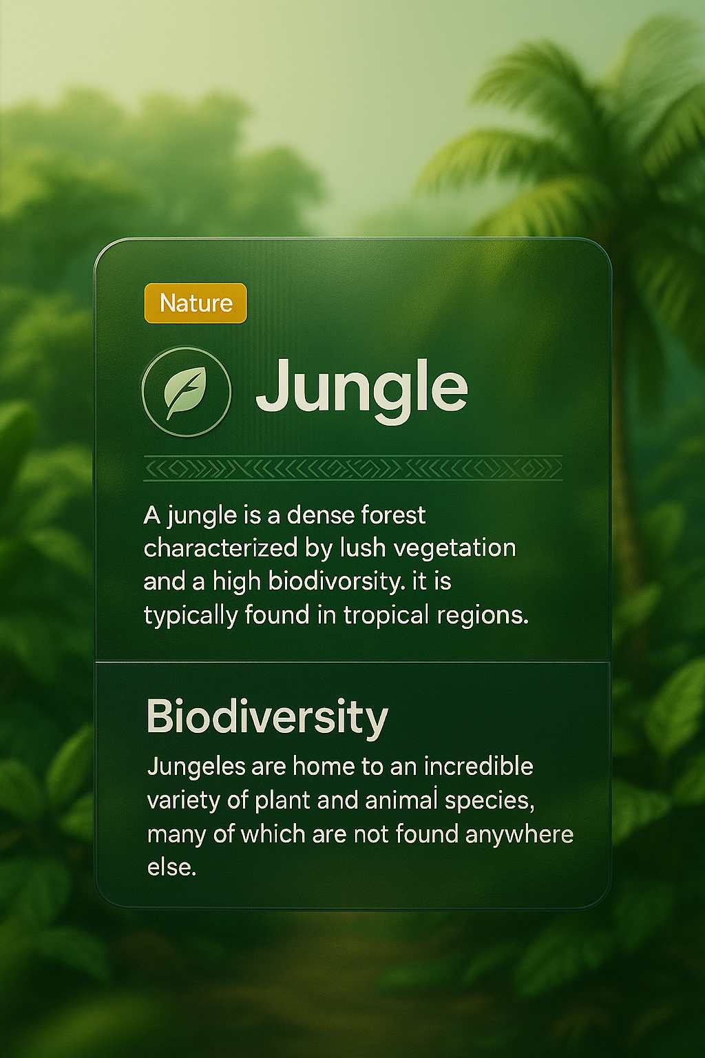 The image features a lush tropical jungle background with a text overlay. The overlay includes two informative blocks, showcasing details about jungles and biodiversity in a cohesive design.