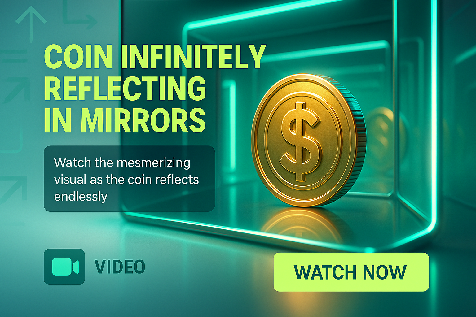 /Collection: /by davooda/Type: PNG/A dynamic 3D graphic showcasing a gold coin reflecting infinitely in a mirrored environment, enhanced by neon lighting, ideal for video promotions or digital content.