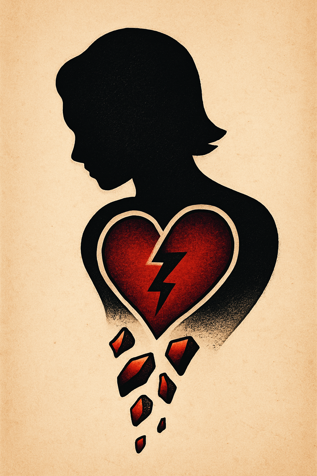 A striking silhouette of a person with a broken heart, featuring shards cascading down. The heart is red with a lightning bolt, set against a subtle beige background.