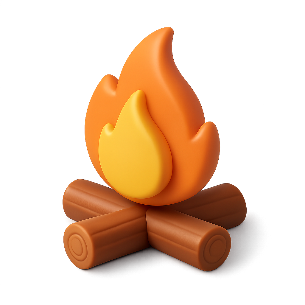 A vibrant 3D icon of a bonfire featuring a stylized flame in orange and yellow, resting on brown logs. The design has a smooth, isometric feel with a transparent background.