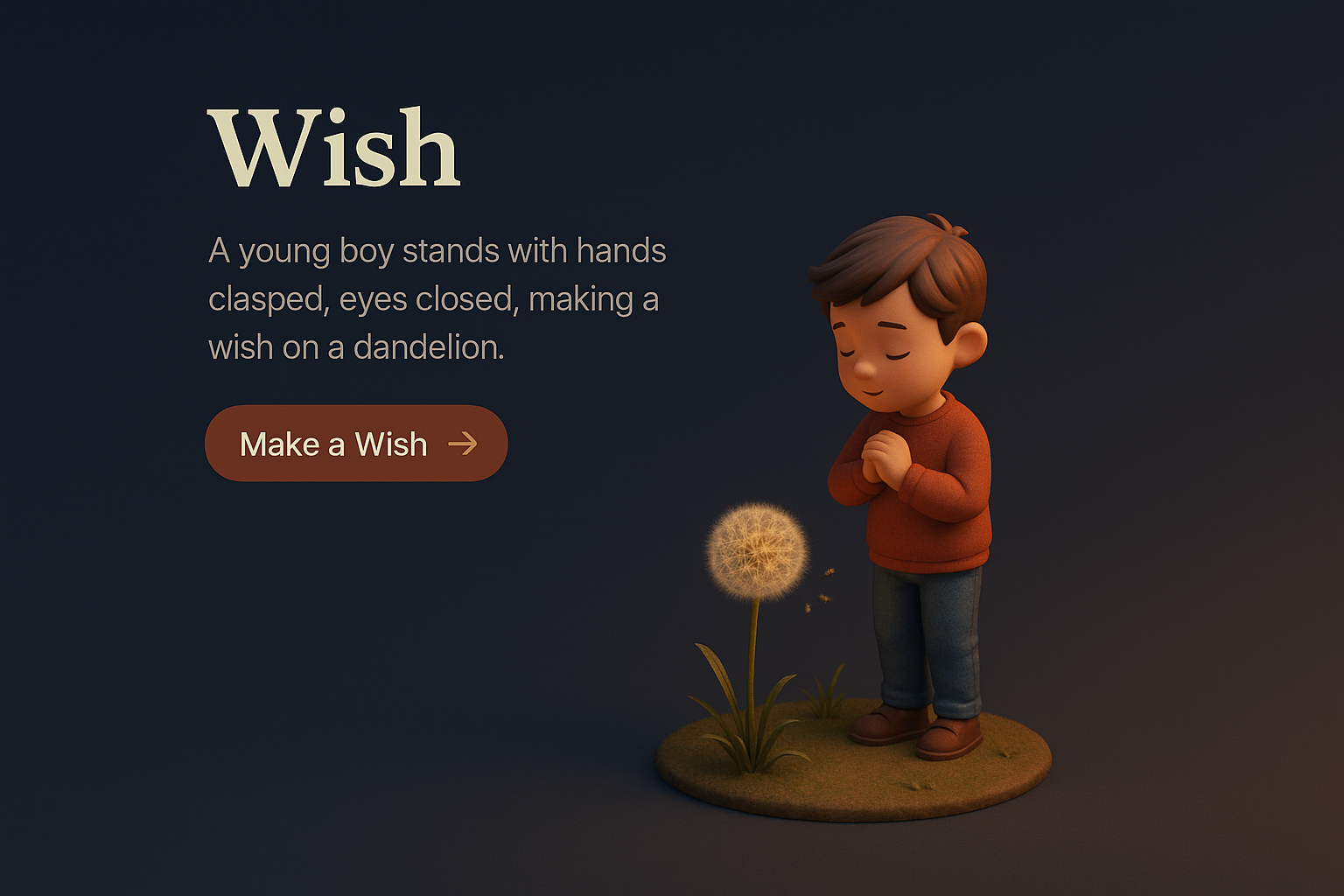 A charming 3D illustration featuring a young boy with clasped hands, eyes closed, standing beside a dandelion, symbolizing a wish. The dark gradient background enhances the rich colors of the scene.