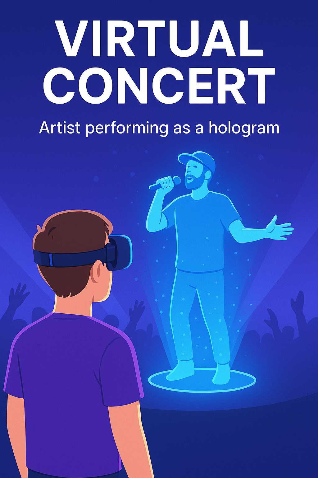 A vibrant digital illustration depicting a virtual concert scene, showcasing a holographic performer and an audience member wearing a VR headset, perfect for promotional or event-related content.
