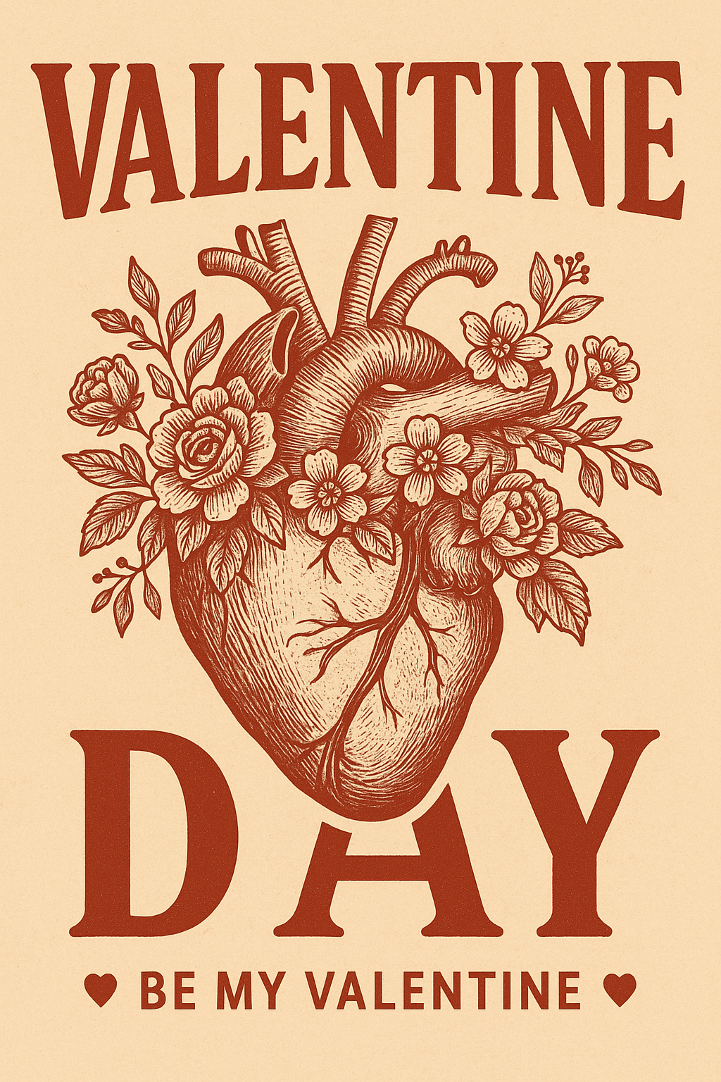 /Collection: /by davooda/Type: PNG/Artistic illustration featuring a heart surrounded by flowers, designed for Valentine's Day. The vintage style and warm colors convey love and affection, making it suitable for greeting cards or romantic decor.