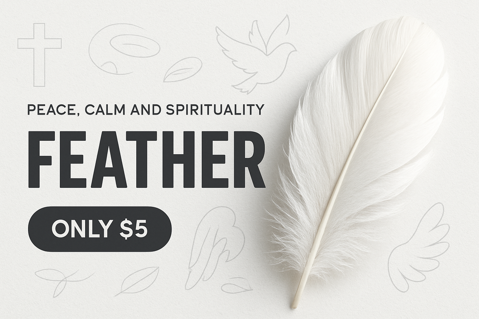 /Collection: /by davooda/Type: PNG/A closeup of a white feather against a light textured background, featuring simple contour drawings. Bold typography emphasizes themes of peace, calm, and spirituality.